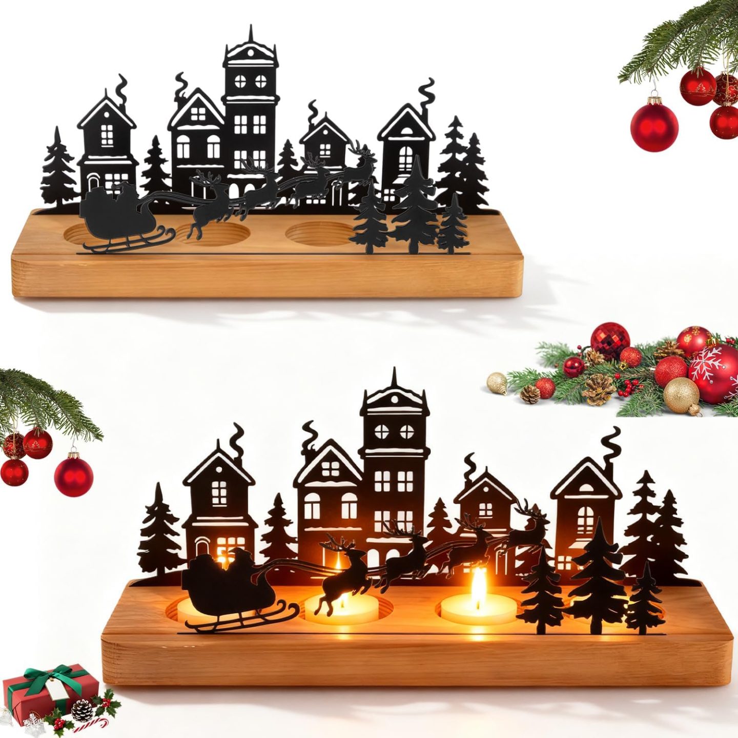 Met 4 kaarsengaten. houten ondergrond en metalen decoratie.