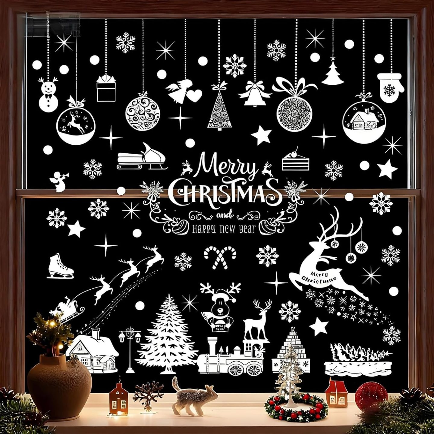 Deze dubbelzijdige, witte zelfklevende stickers zijn onmisbaar voor een gezellig wintertafereel op de voorruit van jouw huis.