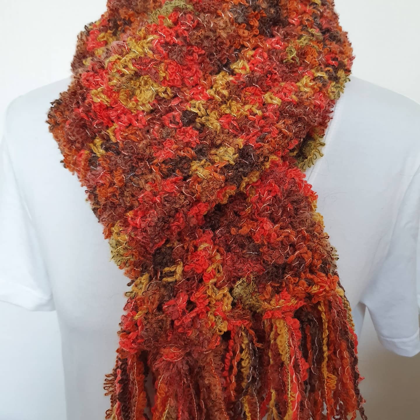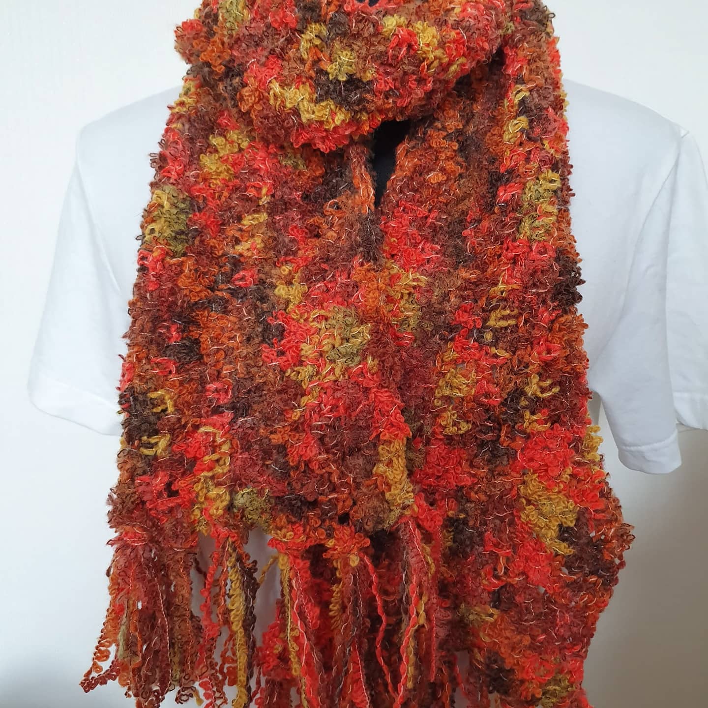 Gehaakte sjaal oranje, geel, bruin met franjes