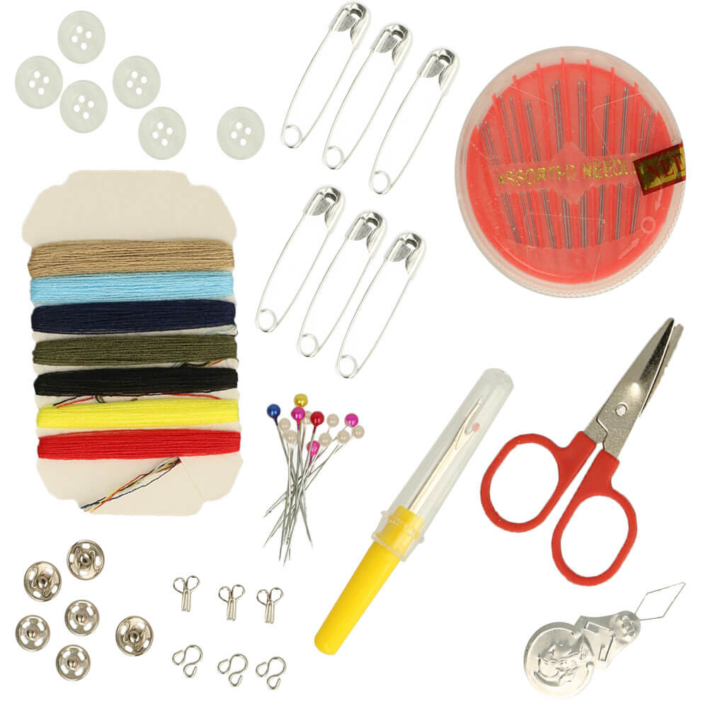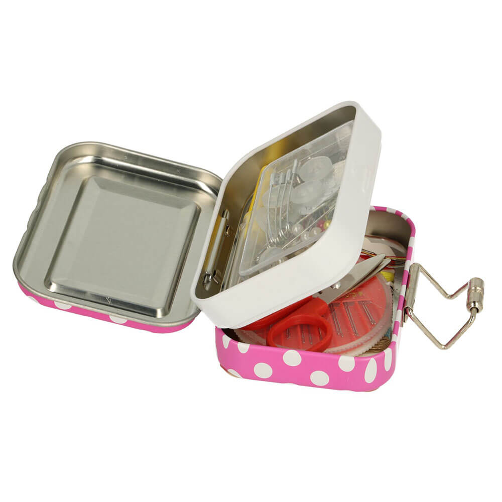 Een handig reparatiesetje, ideaal voor op reis! Dit vrolijk gekleurde reisblikje in handzaam formaat bevat de accessoires die nodig zijn voor een noodreparatie onderweg. De set bevat een klein schaartje, een assortiment aan naalden en garen, spelden, een tornmesje, knoopjes en veiligheidsspelden.
