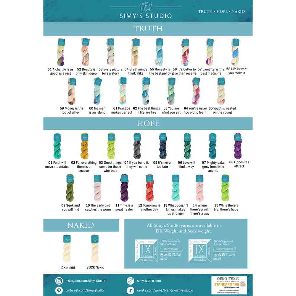 De garencollectie met prachtige textuur in handgeverfde kleuren brengt drie betoverende reeksen: HOPE, TRUTH en NAKID. HOPE en TRUTH bieden elk een palet van 15 verschillende kleuren en iedere kleur is vernoemd naar een spreekwoord dat de essentie van de kleur weergeeft. NAKID is een ongeverfde wol en dient als een blanco canvas voor handwerkers die op zoek zijn naar artistieke vrijheid en hun eigen garen willen verven. Alle kleuren in de drie reeksen zijn verkrijgbaar als DK en Sock gewicht garen. Wat u ook zoekt, de Simy’s Studio Premier Yarn Collection inspireert u bij elke steek.