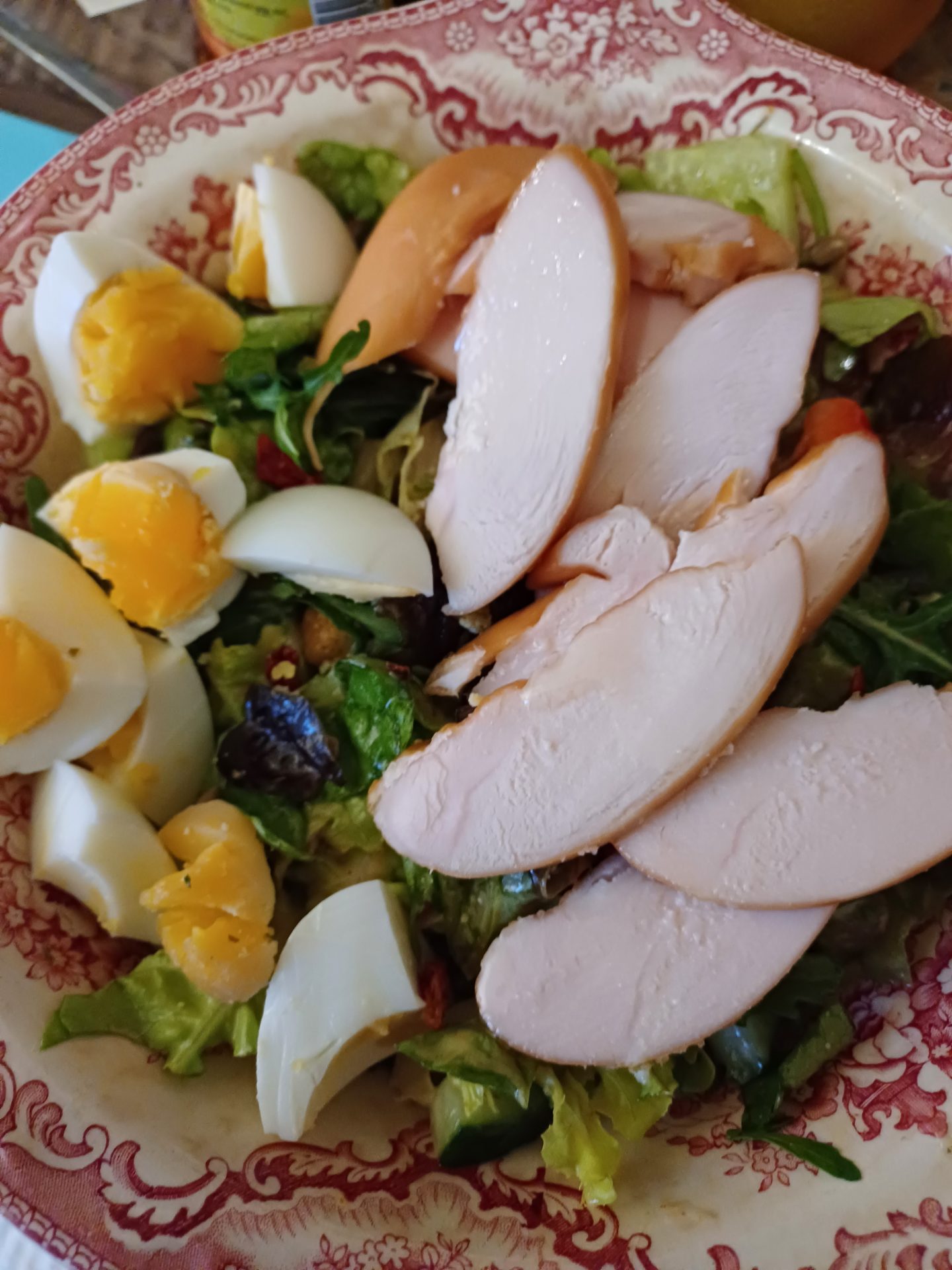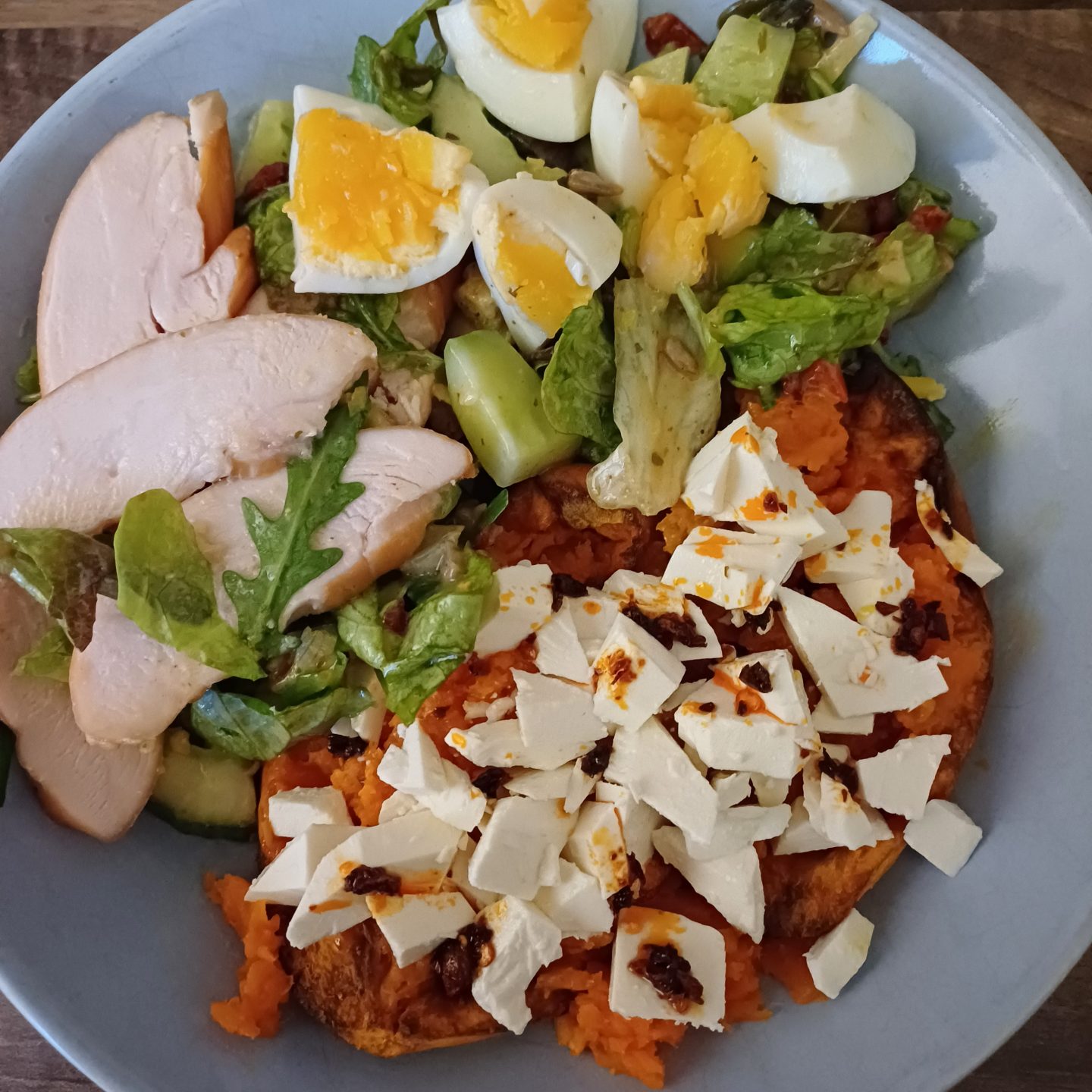 Deze keer een salade met gerookte kip en ei. Hierbij had ik een zoete aardappel.